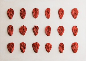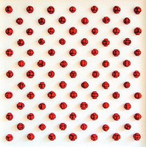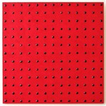 Multiplex paneel , rood gelakte zaden van de blauweregen boom en acryl.