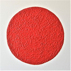 In dit wandobject zijn de 25 ronde bollen gemaakt van papier maché en structuurpasta..De ronde lijst is uit 6 cm dik multiplex gezaagd.