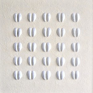 Multiplex paneel , geprepareerde zaden van de blauweregen boom en acryl , met wit houten baklijst