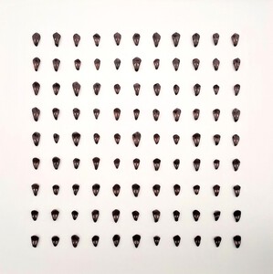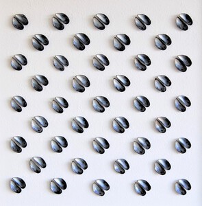 Multiplex paneel, geprepareerde zaden van de blauweregen boom en acryl, met zwart houten baklijst.