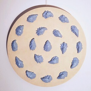 Rond multiplex paneel , oesterschelpen en acryl.
